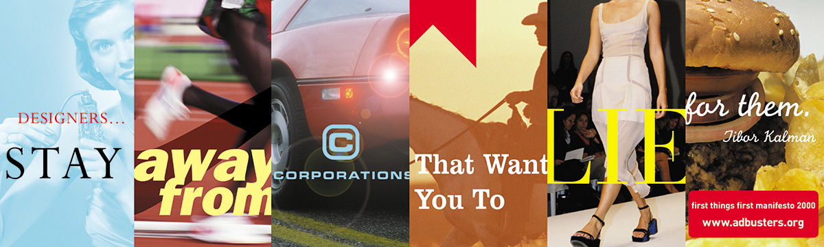 Barnbrook’s use of expressive design to highlight major socio-cultural issues is part of an ongoing movement of designers using their skillsets for more than corporate benefit. He was one of the early designers who was conscious of issues like environmental destruction for corporate benefits, and he wasn’t afraid to give a middle finger to these brands through his work (remember the Vegas billboard?). He lead the reissue of the First Things First manifesto in 2000 (the original was 1964) while working at Canadian non-profit publication Adbusters, as part of his mission to create more social awareness of over consumption through design, and got 33 leading visual communicators to sign on (Emigre, n.d.).