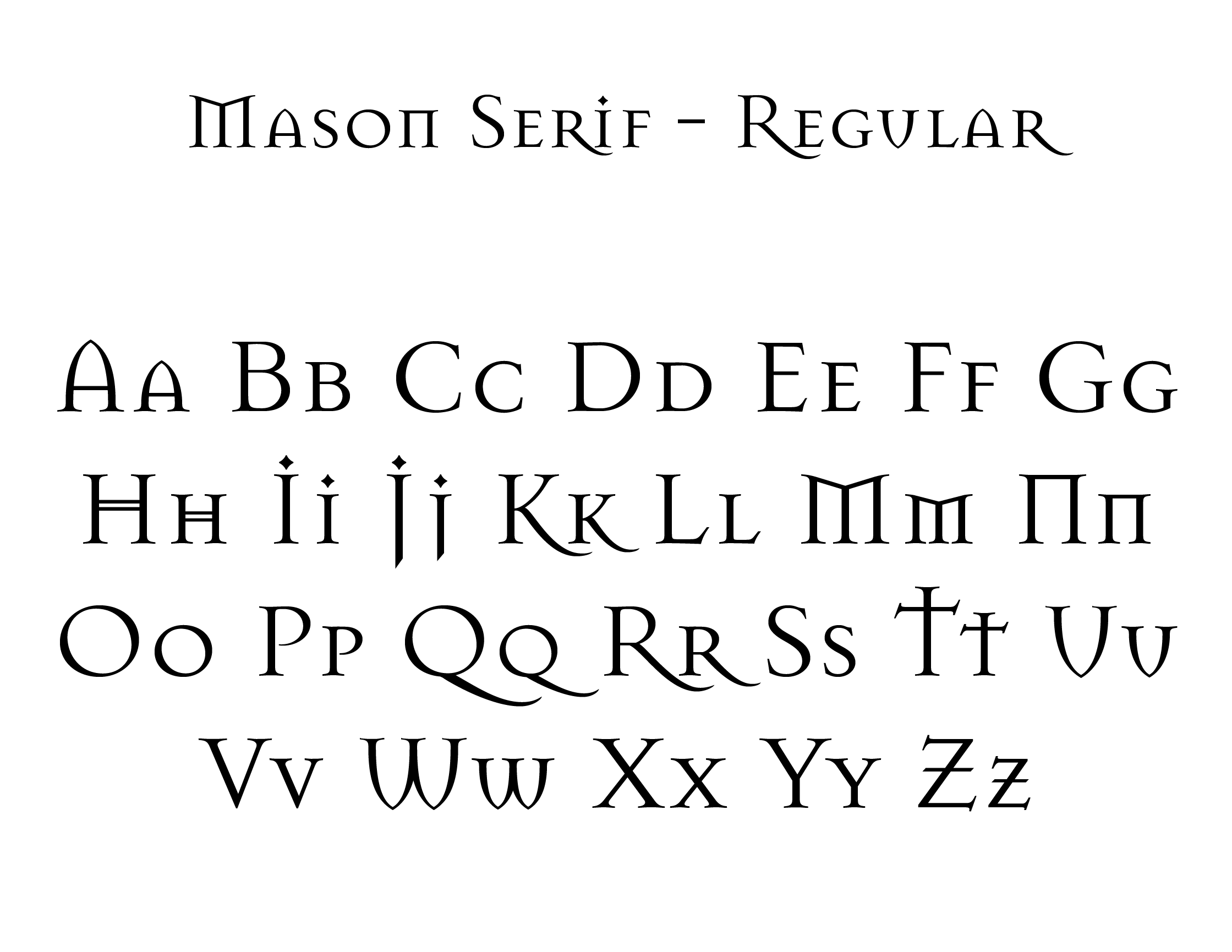 I chose to analyze this typeface because I really enjoy the look of it, and it was almost the winner for my logo design projects wordmark typeface last semester. Mason Serif is an architecturally inspired serif font with old style typeface influences. It uses stroke weight variation, has a diagonal stress axis, and uses bracketed serifs just like old style typefaces. It’s important to note this is a display font with no proper lower case characters, the only options are uppercase letters and small capitals. It only has a Roman stance.